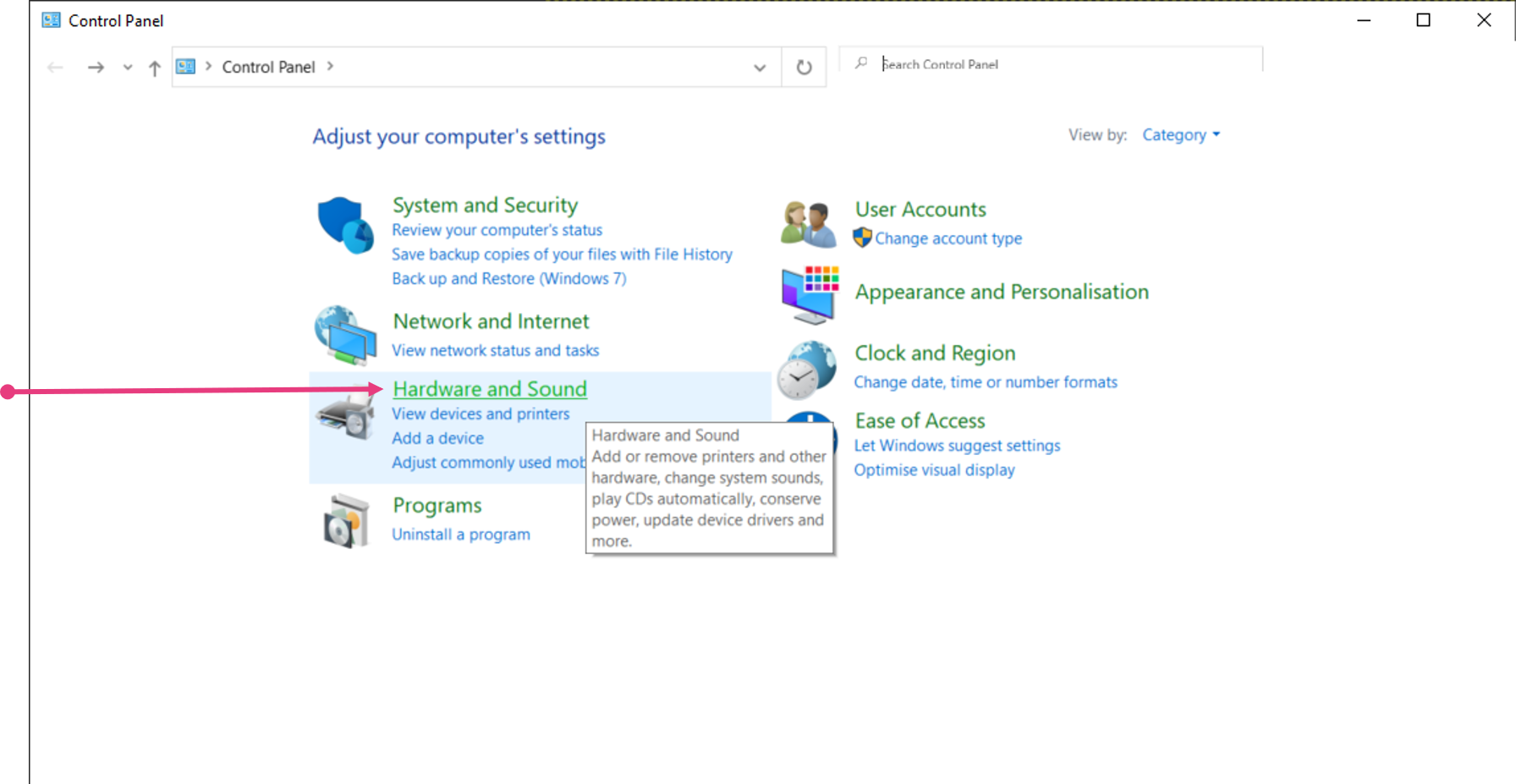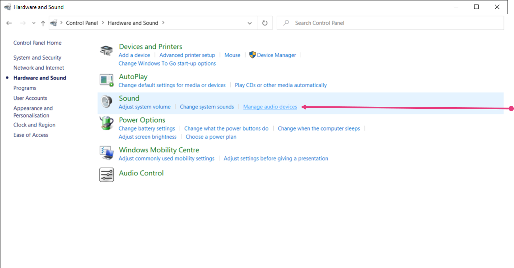 Open the “Control Panel”; Navigate to “Hardware and Sound” > “Sound” > “Manage Audio Devices”