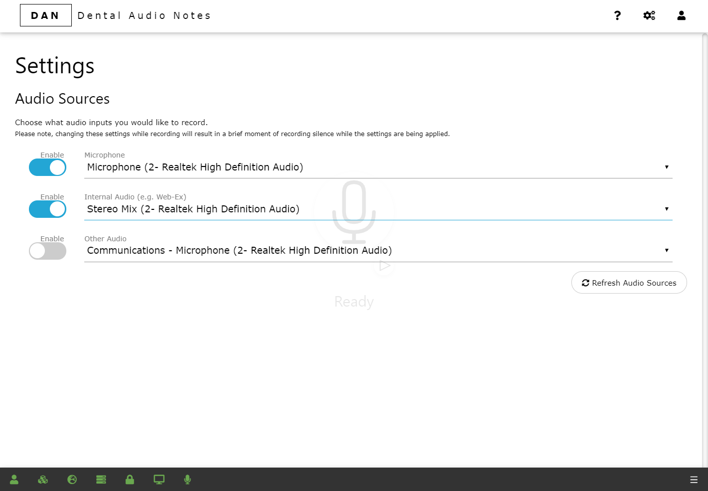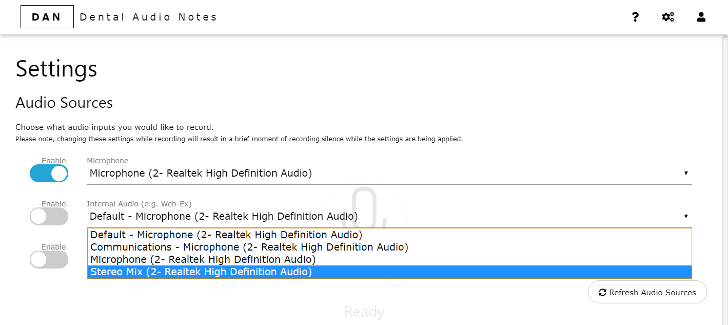 Now you can see “Stereo Mix” in the DAN audio sources settings. Select it and enable the audio source here to start recording the voices of both yourself and your patient.