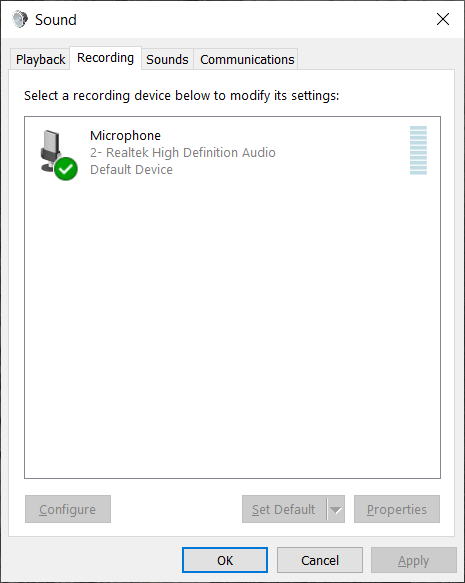 This opens the Sound Control Panel. Select the “Recording” tab.