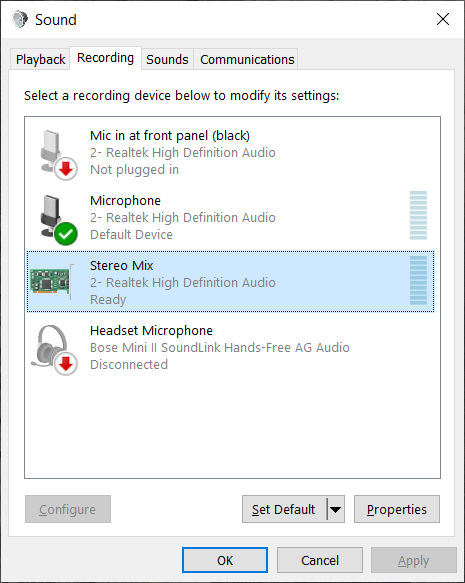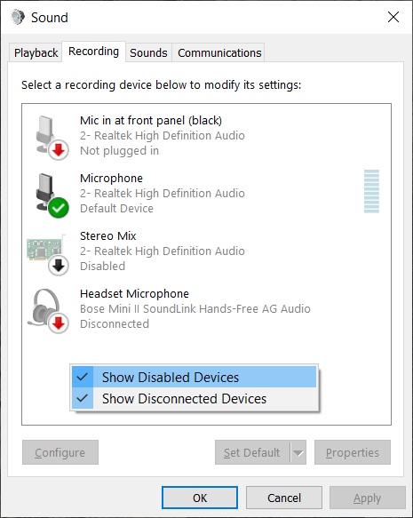 In the pane, right-click on a blank area, and make sure both “Show Disabled Devices” and “Show Disconnected Devices” options are checked. You should see a “Stereo Mix” option appear.