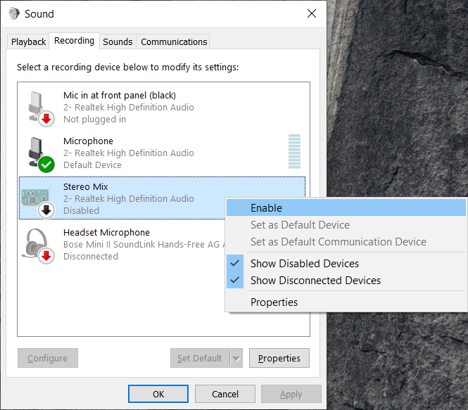 Right-click on “Stereo Mix” and click “Enable” to be able to use it.