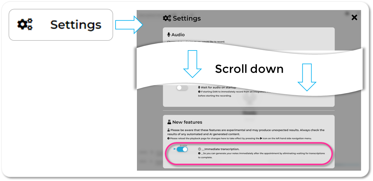 Scroll down to "New features" at the bottom of the settings page and enable Immediate transcription.