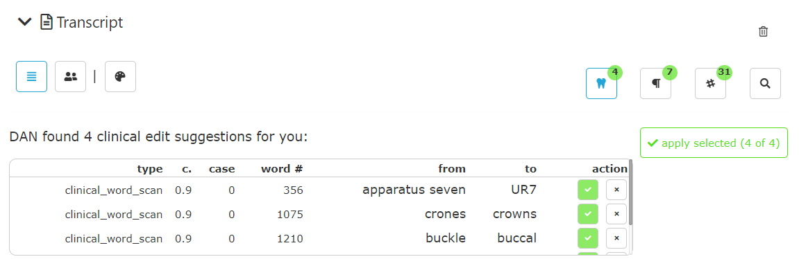 DAN's transcription dictionaries identify and suggest corrections. They run when you open a transcription, displaying the count of items in a green badge. To list, highlight and approve the suggestions, click the icon.