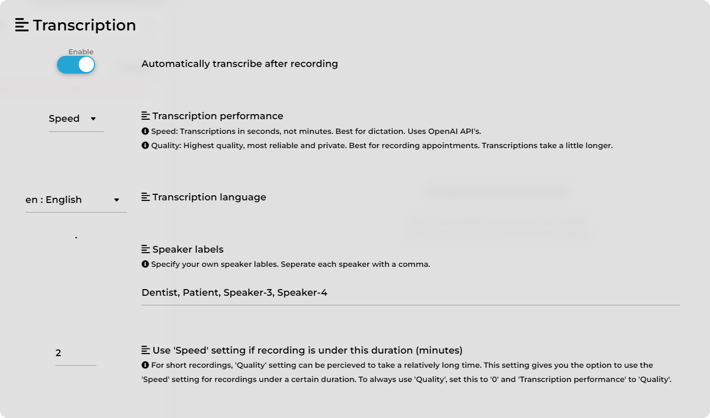 Use speed setting is recording is under this duration: For very quick results for short recordings, the speed setting will be used by default if the recording is under this duration. Default 2.