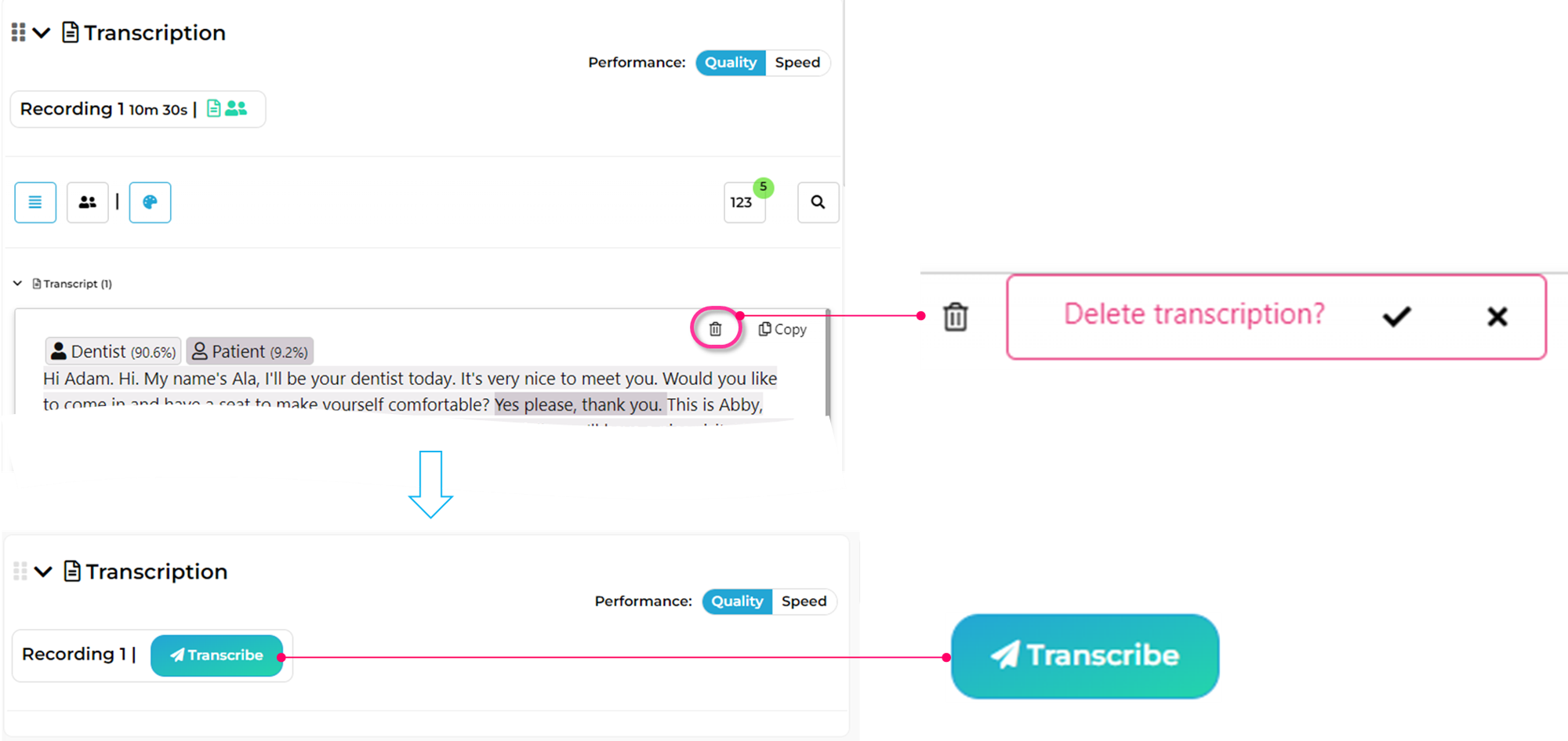 To delete a transcription press the icon () and confirm. You can always transcribe again if you wish.