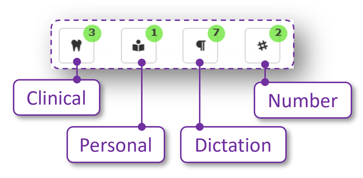 Clinical Dictionary. Identifies potentially incorrect transcription or long-hand of a clinical term, e.g. "buckle" => "buccal" or "upper right 7" => "UR7".