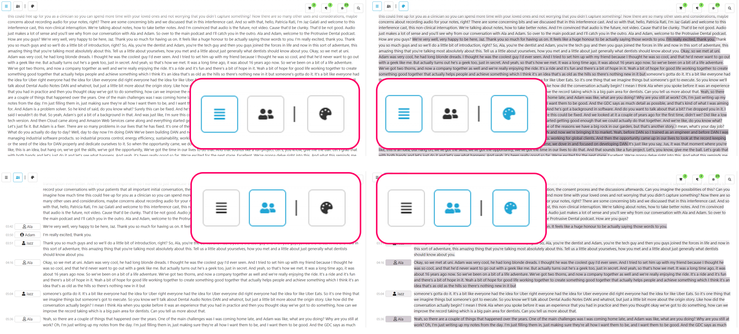 Colour can be toggled on/off to highlight each speaker in a different shade. This is really useful with the paragraph view to give a clear overview with who said what at a glance.